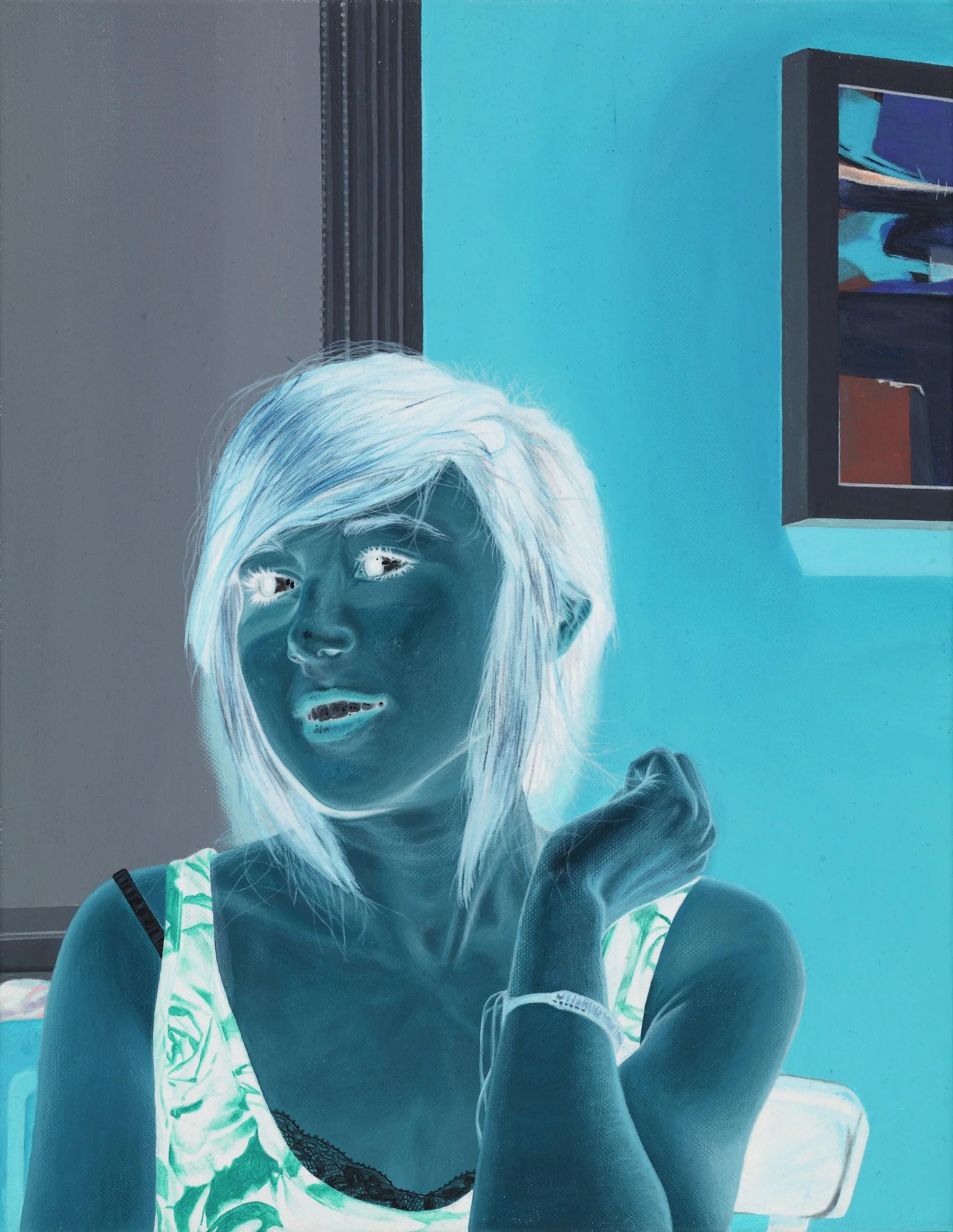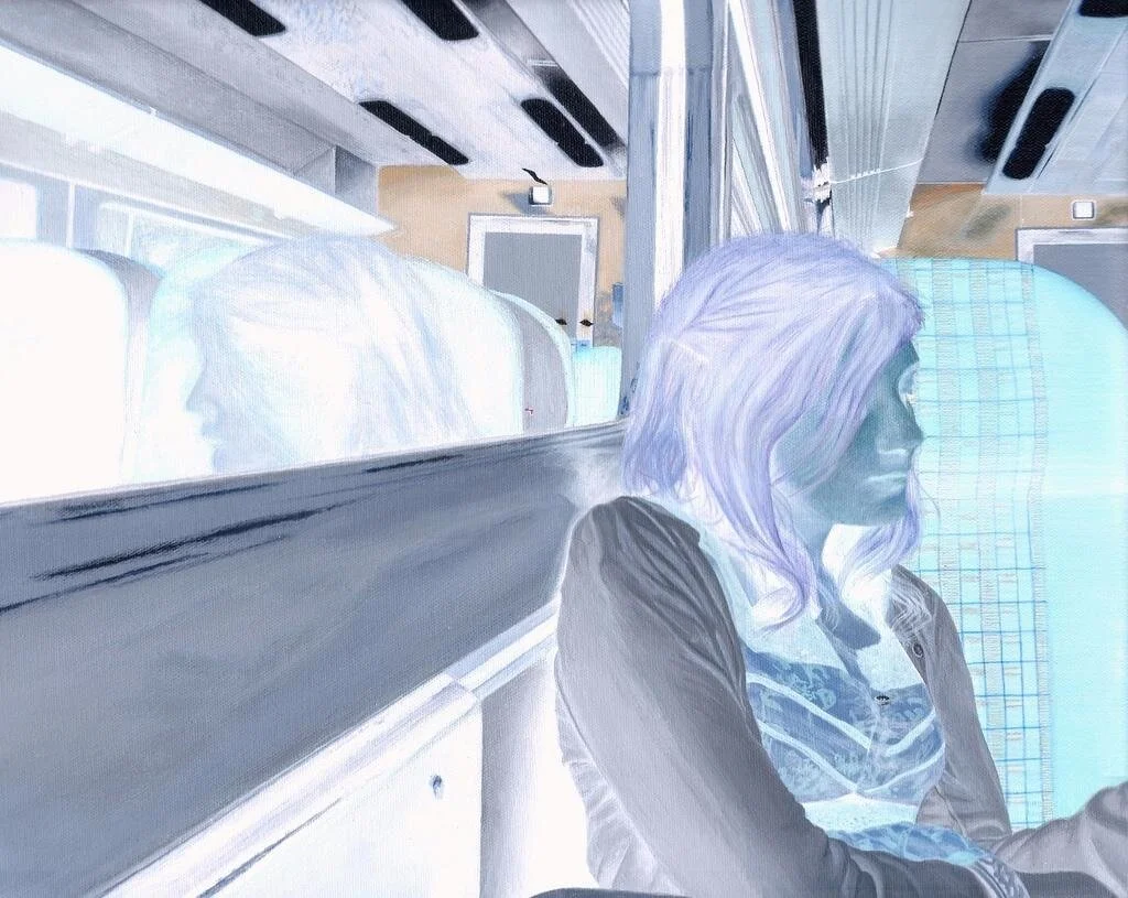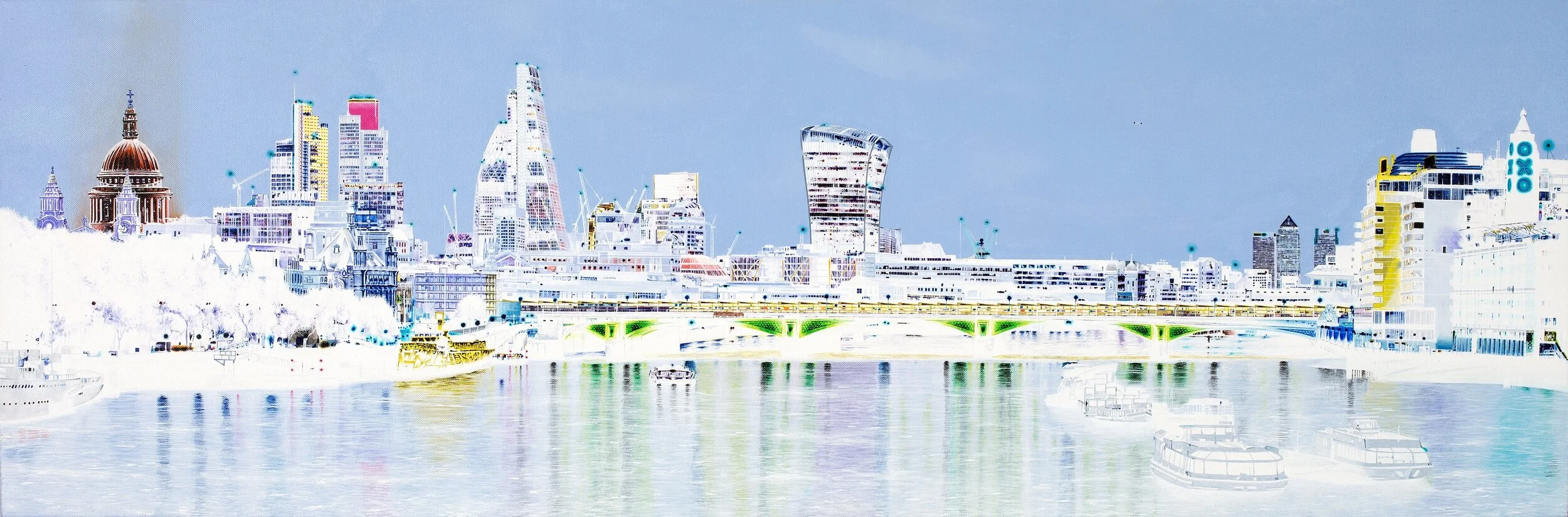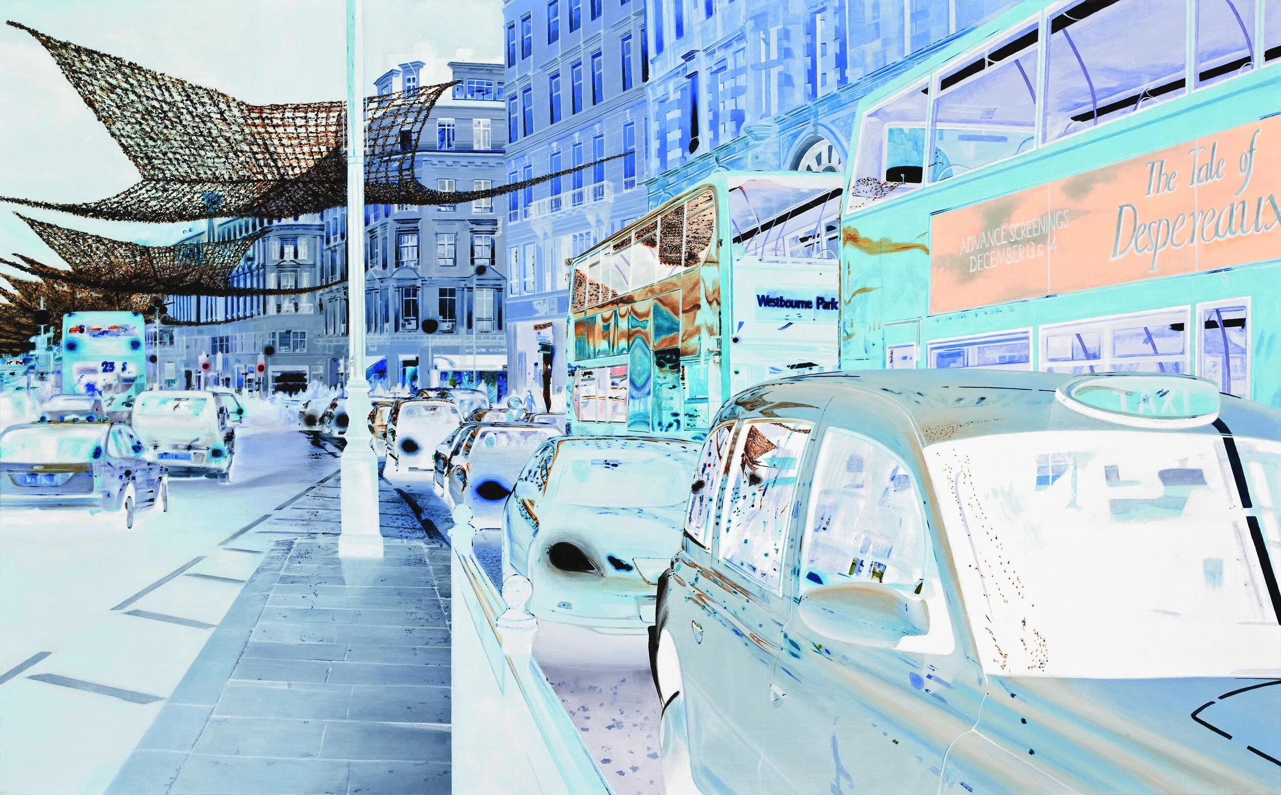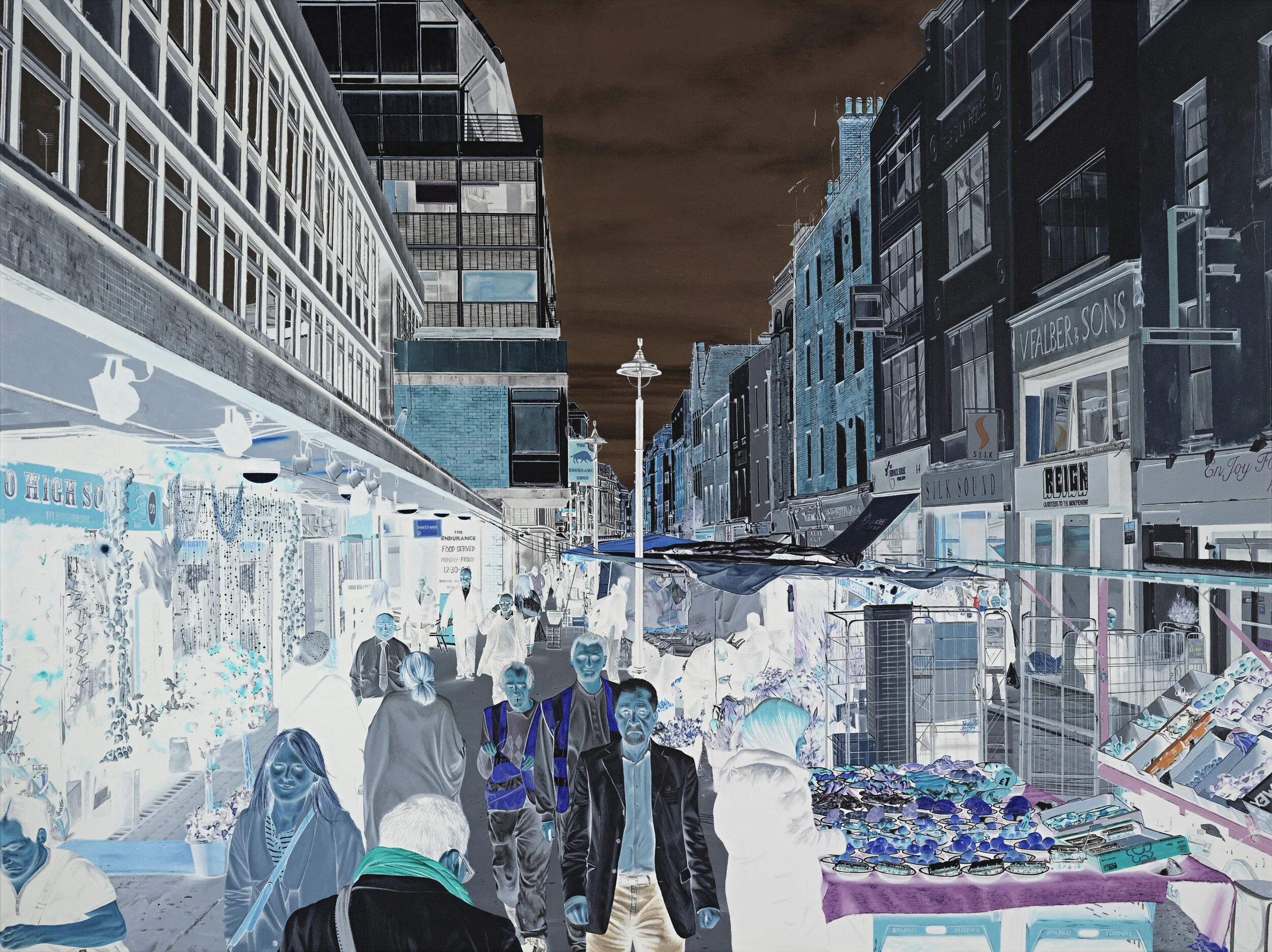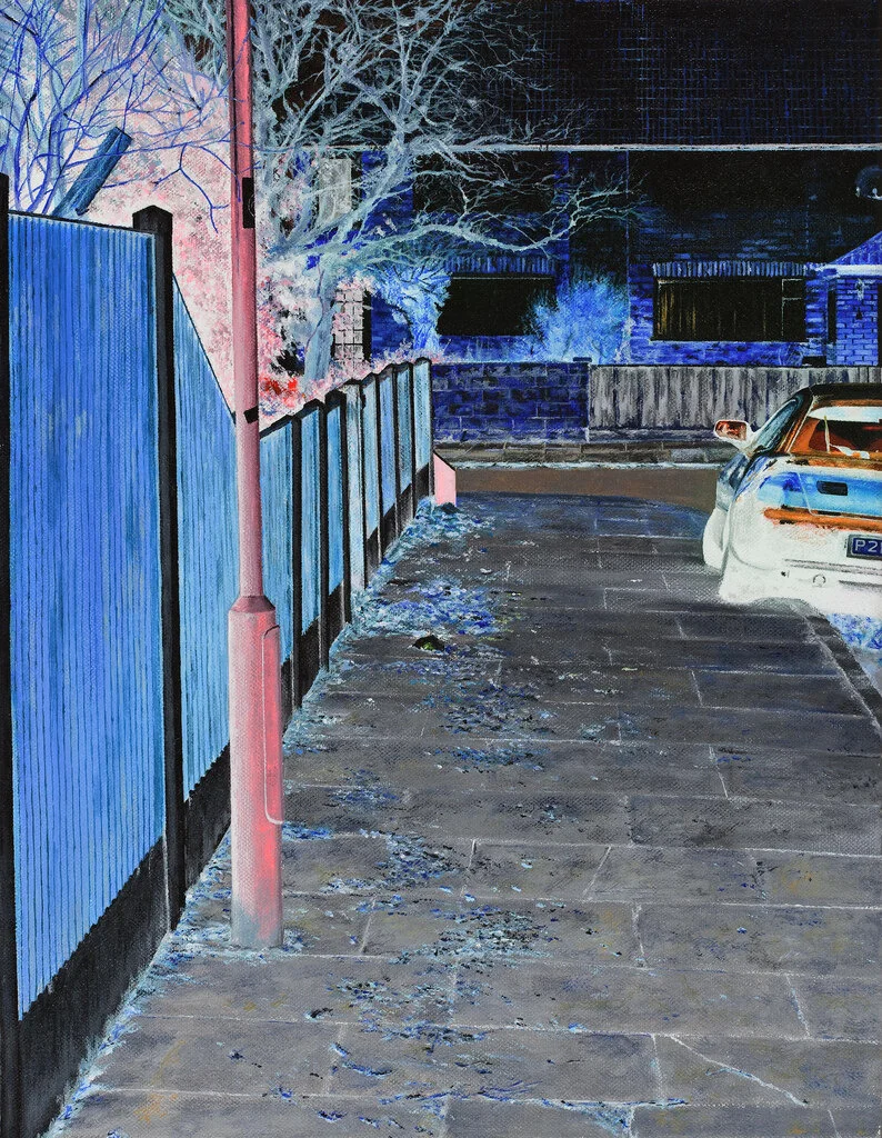 A series of diptych works comprised of an acrylic painting (the ‘Positive’) painted in negative colours, and a print (the ‘Negative’), which is produced by scanning the painting, inverting its colours to the more recognisable spectrum and then printing it at the same size as the original.